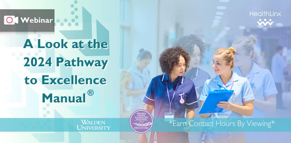 This webinar explores the new 2024 Pathway to Excellence® Application Manual. The presentation describes the major differences between the 2020 and 2024 Pathway to Excellence® Application Manuals and prompts viewers to identify necessary structures and processes to meet new requirements. It also provides strategies to employ when bridging from the 2020 Pathway to Excellence® Application Manual to the 2024 Pathway to Excellence® and Pathway to Excellence in Long-Term Care® Application Manual.